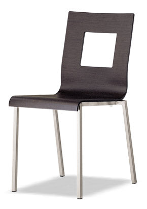 Geometric shapes a stackable chair, with oak veneered multilayer shell stained weng? with square hole on the back.