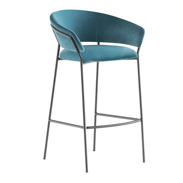 Harmony of shapes, ergonomics and elegance are the characteristics of the Jazz stool. The seat and the curved backrest are supported by a light steel structure. Personalization is ensured by the combination of the upholstery, in fabric or imitation leather, and different steel finishes. Height 770mm