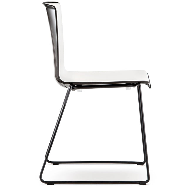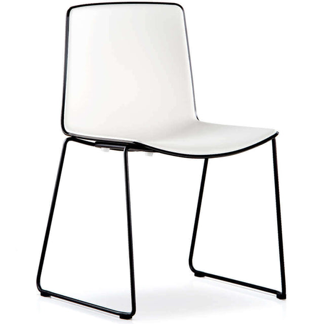 Tweet chair was conceived from the desire of creating a rational piece of furniture suitable to be placed even in the most characteristic spaces, respecting their style. Bi-injected moulding polypropylene shell with sled frame in steel rod