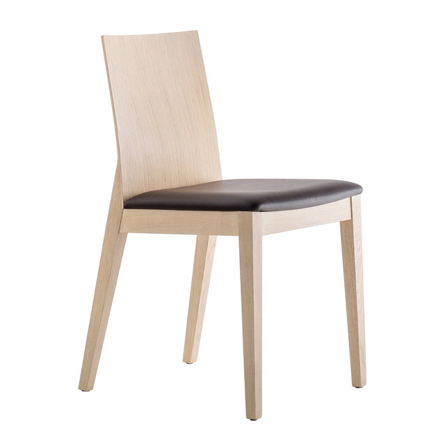 Twig was inspired by an idea of lightness and versatility. The ergonomic shape of the backrest create an harmonious profile. Chair with sandwich panel back, upholstered seat and solid oak legs.