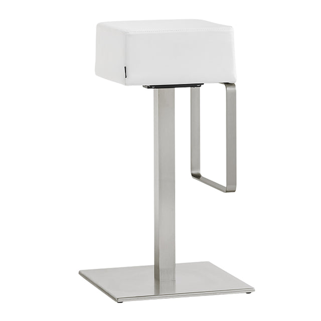 Brushed stainless steel barstool with central base and foot rest fixed to the seat. With square column mm. 50x50, has a comfortable seat upholstered with simil or real leather or a wide choice of fabrics. Swivel version available